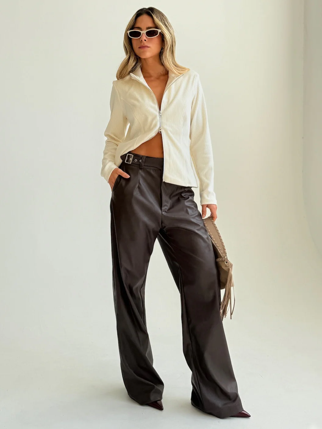 מכנס מבד דמוי עור בשילוב אבזם בצד למראה יוקרתי ולא מתאמץ.